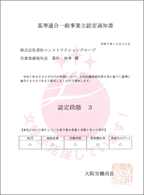 また、髙松コンストラクショングループ単体は、女性活躍推進の取り組みの成果が認められ、厚生労働省が認定する「えるぼし」の最高位(3つ星/3段階目)を取得しました。また、グループ内の事業会社でも、同認定や子育て支援に積極的に取り組む企業を認定する制度 「くるみん」の取得実績があり、女性活躍推進に向けた取り組みはグループ全体で進めています。